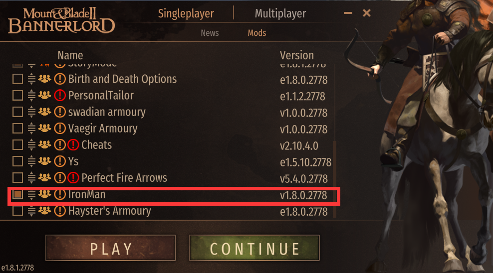 2、在启动器的Mod选项页面,按照下图所示勾选与排序“IronMan”后点击“PLAY”即可正常游戏。