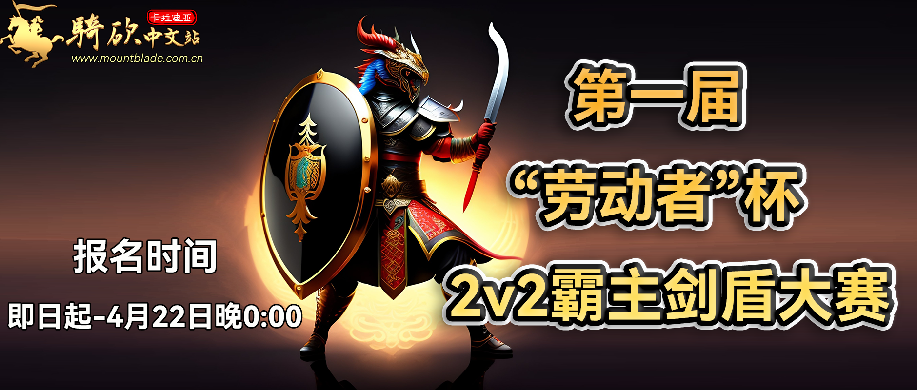 | 赛事介绍 | 各位骑友们,劳动节小长假即将到来,不知道各位是否已经安排好假期了呢?如果没安排别担心,骑马与砍杀中文站为大家准备了长假期间的骑砍2赛事,那就是本次的第一届“劳动者”杯2v2剑盾大赛啦!2v2剑盾大赛是流行于国外联机社群,极具观赏性的一钟比赛形式,加上现在的自定义服务器逐渐完善,流程更为便捷。而为什么叫“劳动者”杯呢?因为在骑马与砍杀中,不可缺少的步兵角色经常被人调侃为骑兵和射手的打工人,扛线人,这也对应到了我们勤勤恳恳,奋战一线,默默付出的劳动者们。所以现在该让步兵展现出他们精湛的技艺,让大家看看什么是步兵的艺术!